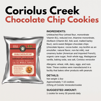 Coriolus Creek Cookies are a daily dietary supplement for the whole family made with the Coriolus versicolor mushroom to help support the body's immune system. These cookies are all-natural and free of hydrogenated oils, trans fats, high-fructose corn syrup, palm oil, preservatives and contain no artificial ingredients. They are lower in sugar than most cookies because they don't require over saturated sweetness to mask lower quality ingredients. They also include a proprietary strain of the Coriolus versicolor mushroom and offer the best value for the money. It is a combination of both Polysaccharide Krestin (PSK) and Polysaccharide Peptide (PSP). The Coriolus versicolor mushroom offers much needed immune support and it can be taken on a daily basis.